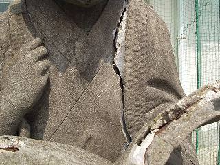 ヒビ割れは左肩から前面、腰紐部分までの約40cmの区間に広がっていました。