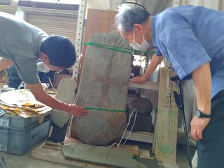 板碑の検分調査を行う三宅先生(右)と長澤学芸員 |